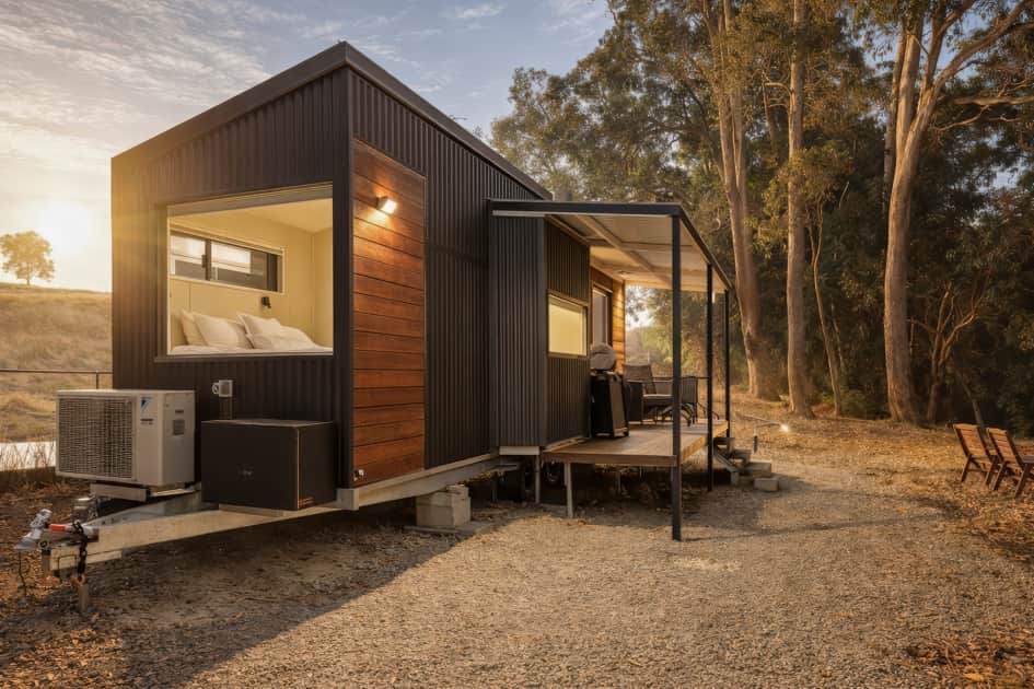 Each tiny home has been carefully curated to maximise comfort while embracing the surrounding landscape. The open-plan living area features a kitchenette and expansive glass doors that invite natural light and uninterrupted views of the surrounding countryside. Unwind in plush electric recliners beside a roaring Meg fire for winter warmth, creating a cosy and inviting atmosphere on cooler evenings. During the warmer months, air-conditioning ensures a cool and comfortable retreat, allowing you to relax in complete comfort year-round.